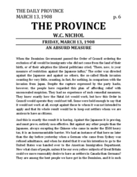 This article is an editorial arguing that the Continuous Journey Law, enacted by the federal government, is ineffective in keeping --undesirable-- (those of Asian and South Asian decent) immigrants out while also having the effect of barring those immigrants deemed as --desirable,-- (those of European decent and a few --upper class-- Asians and South Asians). It also argues that the provincial Natal Act is much more in keeping with the --interests-- of the province and the more effective of the two. |