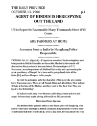 Summary Content type Content type Digital Document Collection(s) Collection(s) Agent of Hindus is Here Spying out the Land Resource Type Resource Type Text Genre Genre reporting Origin Information Origin Information Place Vancouver, B.C. Date Created/Date Issued 1906-10-13 Publisher The Province Frequency Daily Abstract/Description Description / Synopsis Description / Synopsis Article discusses the arrival of a South Asian employed by the Bengal government to evaluate the suitability of British Columbia for emigration for South Asians. Language Language English Physical Description Physical Description Note Physical Description Note PUBLISHED Identifiers Local Identifier Local Identifier SAM-23a Notes Note Note Type version identification Note Transcript of original article Access and Rights Rights Statement Rights Statement IN COPYRIGHT - EDUCATIONAL USE PERMITTED Use License Use License Attribution-NonCommercial-ShareAlike 4.0 International (CC BY-NC-SA 4.0) Subjects and Classifications Subject Topic Subject Topic British Columbia -- Emigration and immigration -- Social aspects