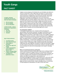A gang is a structured group of individuals who use intimidation and violence to carry out criminal acts in order to gain power and status or to control certain lucrative activities. A youth gang is “any durable, street-oriented youth group whose involvement in illegal activity is part of its group identity”. Most youth gang members belong to street gangs rather than a criminal business organization. Almost half of youth gangs are multi-ethnic. Often there is an identifiable leader and members display or wear common colors or other insignia. Less than 0.5% of Canada’s youth belong to a gang; most members are male (88%) and nearly half are 17 years of age or younger. Finding group identity, a sense of safety, an opportunity to get ‘easy’ money, or excitement has great appeal for youth. The extent to which youth are willing to obtain these things through illegitimate means is typically higher among those who experience the greatest levels of inequality and social disadvantage within society.