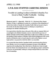 Summary Content type Content type Digital Document Collection(s) Collection(s) C.P.R. has stopped carrying Hindus Resource Type Resource Type Text Genre Genre reporting Origin Information Origin Information Place Vancouver, B.C. Date Created/Date Issued 1908-04-13 Publisher The Province Frequency Daily Abstract/Description Description / Synopsis Description / Synopsis This article describes the decision of the Canadian Pacific Railway to stop accepting South Asian passengers travelling to British Columbia due to the difficulties they face in being allowed to land. ᅧ Language Language English Physical Description Physical Description Note Physical Description Note PUBLISHED Identifiers Local Identifier Local Identifier SAM-87a Notes Note Note Type version identification Note Transcript of original article Access and Rights Rights Statement Rights Statement IN COPYRIGHT - EDUCATIONAL USE PERMITTED Use License Use License Attribution-NonCommercial-ShareAlike 4.0 International (CC BY-NC-SA 4.0) Subjects and Classifications Subject Topic Subject Topic Emigration and immigration law -- Canada Subject Name Organization Subject Name Organization Canadian Pacific Railway Company