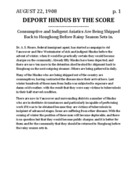 Summary Content type Content type Digital Document Collection(s) Collection(s) Deport Hindus by the score Resource Type Resource Type Text Genre Genre reporting Origin Information Origin Information Place Vancouver, B.C. Date Created/Date Issued 1908-08-22 Publisher The Province Frequency Daily Abstract/Description Description / Synopsis Description / Synopsis This article discusses Dr. Monro--s efforts to see a large number of landed South Asian immigrants deported due to illness or poverty before the winter season. Language Language English Physical Description Physical Description Note Physical Description Note PUBLISHED Identifiers Local Identifier Local Identifier SAM-90a Notes Note Note Type version identification Note Transcript of original article Access and Rights Rights Statement Rights Statement IN COPYRIGHT - EDUCATIONAL USE PERMITTED Use License Use License Attribution-NonCommercial-ShareAlike 4.0 International (CC BY-NC-SA 4.0) Subjects and Classifications Subject Topic Subject Topic Deportation -- British Columbia Emigration and immigration law -- Canada British Columbia -- Emigration and immigration -- Economic aspects Subject Name Person Subject Name Person Monro, A.S., 1872-1932