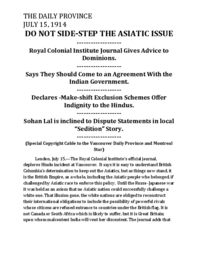 This article discusses the reaction of the British Imperial government to the decision to exclude the passengers of the Komagata Maru, and therefore all South Asian immigrants, and suggests that steps must be taken for clear-cut laws and agreements to be put in place so as to avoid further protracted conflicts that lead to considerable resentment. It also publishes a denial to the claims that a number of local South Asians were being recruited to return to India in order to lead a rebellion against the British government.