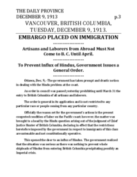 This article discusses a new order-in-council passed by the federal government barring any and all immigration of labourers or artisans to British Columbia until April in response to the decision of Chief Justice Hunter that the previous orders-in-council that blocked South Asian immigration were invalid.