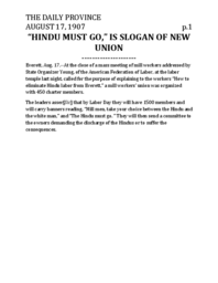 Summary Content type Content type Digital Document Collection(s) Collection(s) "Hindu Must Go" Is Slogan of New Union Resource Type Resource Type Text Genre Genre reporting Origin Information Origin Information Place Vancouver, B.C. Date Created/Date Issued 1907-08-17 Publisher The Province Frequency Daily Abstract/Description Description / Synopsis Description / Synopsis This article discusses a move by an American union to boycott the employment of South Asian immigrants in a mill in Everett, Washington. Language Language English Physical Description Physical Description Note Physical Description Note PUBLISHED Identifiers Local Identifier Local Identifier SAM-31a Notes Note Note Type version identification Note Transcript of original article Access and Rights Rights Statement Rights Statement IN COPYRIGHT - EDUCATIONAL USE PERMITTED Use License Use License Attribution-NonCommercial-ShareAlike 4.0 International (CC BY-NC-SA 4.0) Subjects and Classifications Subject Topic Subject Topic United States -- Emigration and immigration