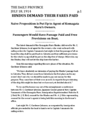 Summary Content type Content type Digital Document Collection(s) Collection(s) Hindus demand their fares paid Resource Type Resource Type Text Genre Genre reporting Origin Information Origin Information Place Vancouver, B.C. Date Created/Date Issued 1914-07-18 Publisher The Province Frequency Daily Abstract/Description Description / Synopsis Description / Synopsis This article discusses the conflict between the Komagata Maru passengers and the owners of the ship. The passengers are refusing to allow the ship to return unless their fairs to Calcutta and all provisions are paid for by the company. Language Language English Physical Description Physical Description Note Physical Description Note PUBLISHED Identifiers Local Identifier Local Identifier SAM-200a Notes Note Note Type version identification Note Transcript of original article Access and Rights Rights Statement Rights Statement IN COPYRIGHT - EDUCATIONAL USE PERMITTED Use License Use License Attribution-NonCommercial-ShareAlike 4.0 International (CC BY-NC-SA 4.0) Subjects and Classifications Subject Topic Subject Topic Komagata Maru Incident, 1914 Subject Name Person Subject Name Person Bird, J.E., 1868-1948 Reid, Malcolm Robert James, 1876-1936