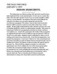 Summary Content type Content type Digital Document Collection(s) Collection(s) Indian anarchists Resource Type Resource Type Text Genre Genre reporting Origin Information Origin Information Place Vancouver, B.C. Date Created/Date Issued 1909-01-09 Publisher The Province Frequency Daily Abstract/Description Description / Synopsis Description / Synopsis This--editorial discusses the nationalist movement and their use of the gramophone to attract crowds and broadcast their message through recorded speeches and songs as well as the banning of such broadcasts by the British government. Language Language English Physical Description Physical Description Note Physical Description Note PUBLISHED Identifiers Local Identifier Local Identifier SAM-119a Notes Note Note Type version identification Note Transcript of original article Access and Rights Rights Statement Rights Statement IN COPYRIGHT - EDUCATIONAL USE PERMITTED Use License Use License Attribution-NonCommercial-ShareAlike 4.0 International (CC BY-NC-SA 4.0) Subjects and Classifications Subject Topic Subject Topic India -- History -- British occupation, 1765-1947