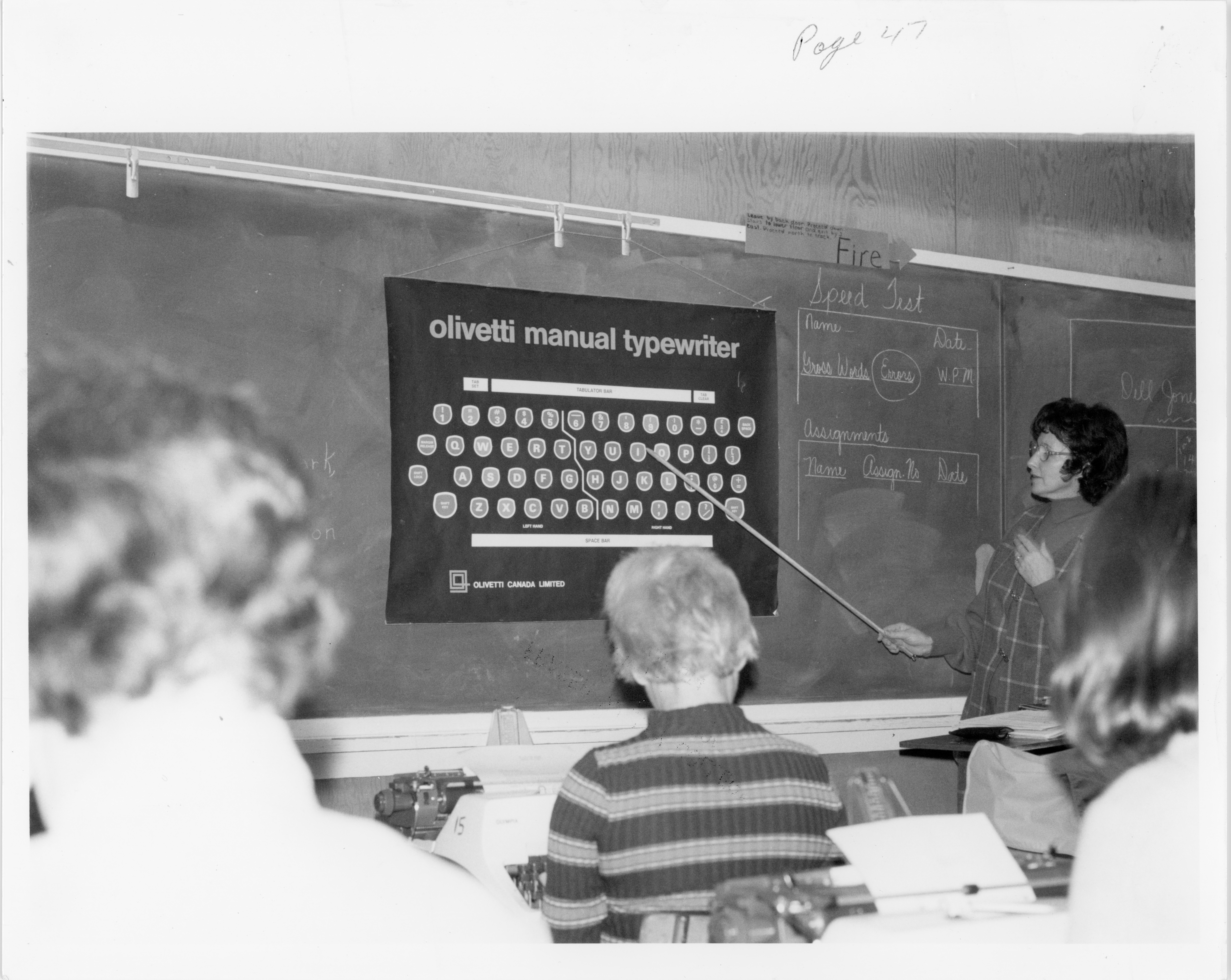 This is an instructor in the Office Careers program (now known as Applied Business Technology – named changed in late 1990s). This is one of UFV’s longest-running programs and has supplied office-ready graduates to private businesses, school districts, the correctional services, public offices, and UFV itself for all of our 49 years. She is demonstrating the placement of keys on a typewriter.