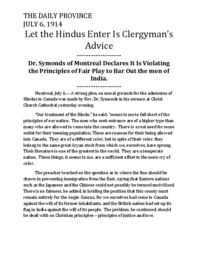 Summary Content type Content type Digital Document Collection(s) Collection(s) Let the Hindus enter is clergyman's advice Resource Type Resource Type Text Genre Genre reporting Origin Information Origin Information Place Vancouver, B.C. Date Created/Date Issued 1914-07-06 Publisher The Province Frequency Daily Abstract/Description Description / Synopsis Description / Synopsis This article contains a plea by a Dr. Symonds to cease discriminating against Asian and South Asian immigrants. Language Language English Physical Description Physical Description Note Physical Description Note PUBLISHED Identifiers Local Identifier Local Identifier SAM-194a Notes Note Note Type version identification Note Transcript of original article Access and Rights Rights Statement Rights Statement IN COPYRIGHT - EDUCATIONAL USE PERMITTED Use License Use License Attribution-NonCommercial-ShareAlike 4.0 International (CC BY-NC-SA 4.0) Subjects and Classifications Subject Topic Subject Topic Komagata Maru Incident, 1914 British Columbia -- Emigration and immigration -- Social aspects