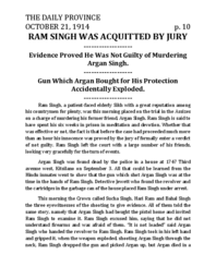 Summary Content type Content type Digital Document Collection(s) Collection(s) Ram Singh was acquitted by jury Resource Type Resource Type Text Genre Genre reporting Origin Information Origin Information Place Vancouver, B.C. Date Created/Date Issued 1914-10-21 Publisher The Province Frequency Daily Abstract/Description Description / Synopsis Description / Synopsis This article discusses the trial of Ram Singh for the shooting of Argan Singh. The death was initially linked to Argan Singh--s participation in the Komagata Maru incident but was finally ruled an accident leading to Ram Singh--s acquittal. Language Language English Physical Description Physical Description Note Physical Description Note PUBLISHED Identifiers Local Identifier Local Identifier SAM-259a Notes Note Note Type version identification Note Transcript of original article Access and Rights Rights Statement Rights Statement IN COPYRIGHT - EDUCATIONAL USE PERMITTED Use License Use License Attribution-NonCommercial-ShareAlike 4.0 International (CC BY-NC-SA 4.0) Subjects and Classifications Subject Topic Subject Topic Komagata Maru Incident, 1914 Subject Name Person Subject Name Person Hopkinson, William Charles, 1880-1914 Singh, Bela, 1883-1934