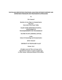 The focus of this major paper will be to analyze intensive support and supervision programs (ISSP) and wraparound services as prevention and intervention approaches for youth involved in gangs. This will include reviewing literature and interpreting the results from a survey administered to five ISSP workers and five youth probation officers to better understand why youth join gangs, the needs of youth who are at-risk or involved in gangs, common challenges youth experience when exiting a gang, and the types of approaches used to assist youth leave a gang. This paper will also examine the formation, demographics, and the history of gangs, including those in British Columbia (BC), as well as provide an overview of Canadian laws and policies that have influenced the use of ISSP and wraparound services in recent years. |