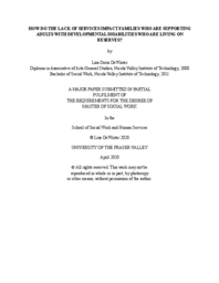 Families fulfill vital roles providing care, to their adult family members who have intellectual and/or developmental disabilities and live on-reserve within British Columbia. When looking at what impacts an Indigenous family’s ability to provide ongoing quality care the complex relationship among service need and services used is identified. There exist two world views about disability yet there remains only one system of care. This literature review examines who the services providers are and how their services impact families living on reserve. |