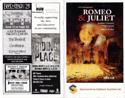 Summary Content type Content type Digital Document Collection(s) Collection(s) Theatre Resource Type Resource Type Text Genre Genre theater programs Origin Information Origin Information Date Created/Date Issued 2014-03-05 Persons and Affiliations Organizations Author (aut): UFV Theatre Department Abstract/Description Description / Synopsis Description / Synopsis Program for Romeo and Juliet, performed March 5-23, 2014. By Hans Christian Andersen. Adapted and directed by Paul Gelineau. Performed at the University of the Fraser Valley Theatre, Chilliwack, BC. Access and Rights Rights Statement Rights Statement IN COPYRIGHT Subjects and Classifications Subject Topic Subject Topic Theatre Geographic Subject Geographic Subject Chilliwack, British Columbia