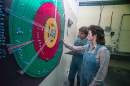 Agriculture Students on Practicum. The Female Student Is Named Ruby. They Are Using a Manual 365-Day Rotating Calendar. Each Push Pin Represents a Cow. Used to Track Pregnancies for Herd Management. 1986. Photographs, 1 negative. UFV Photo Archives. https://ufv-i2.arcabc.ca/ufv-photo-archives/agriculture-students-practicum-female-student-named-ruby-they-are-using-manual.