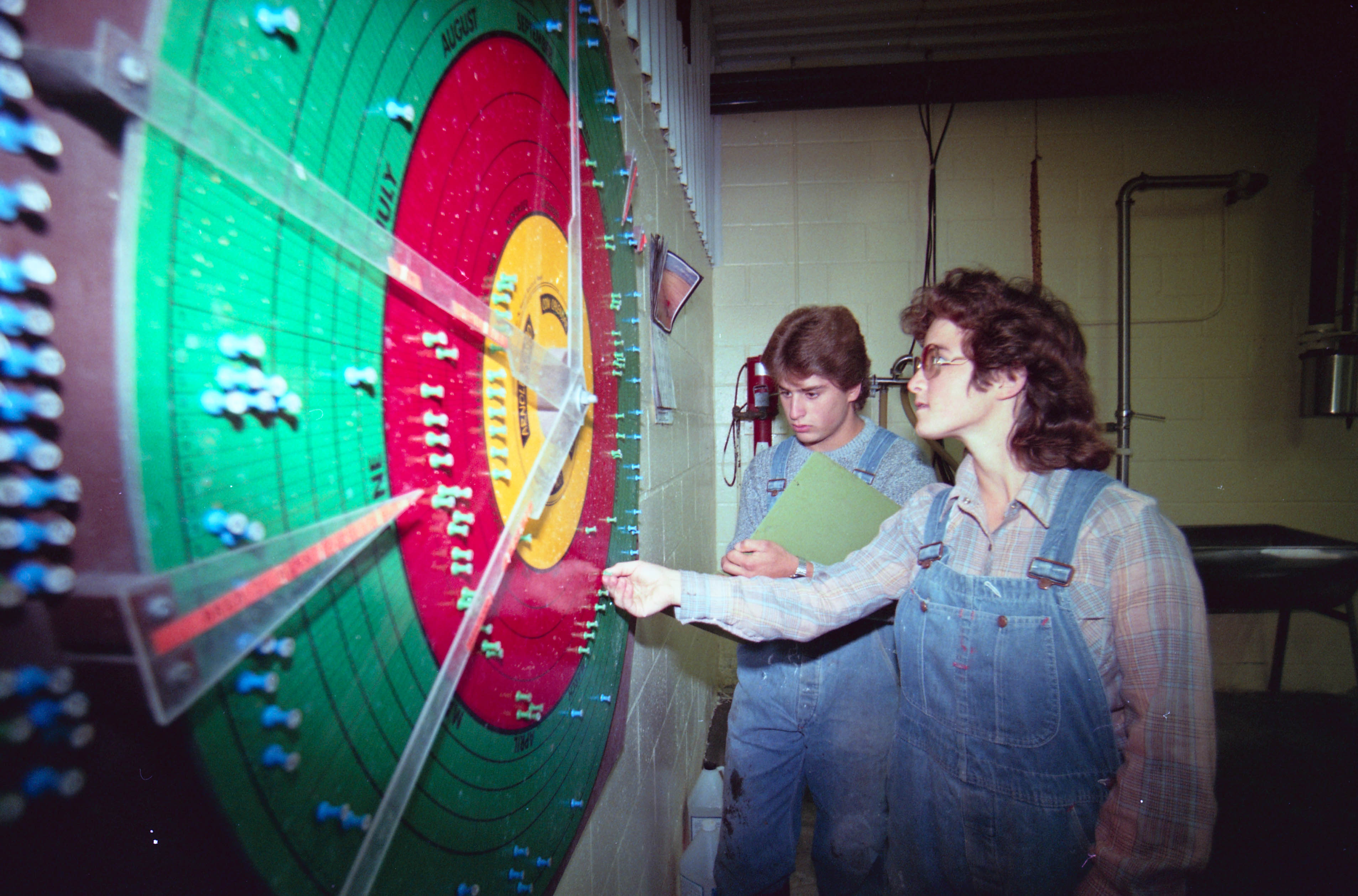 Agriculture students on practicum. Ruby Schmitt (later Peterson) and Victor de Sories. They are using a manual 365-day rotating calendar. Each push pin represents a cow. Used to track pregnancies for herd management.