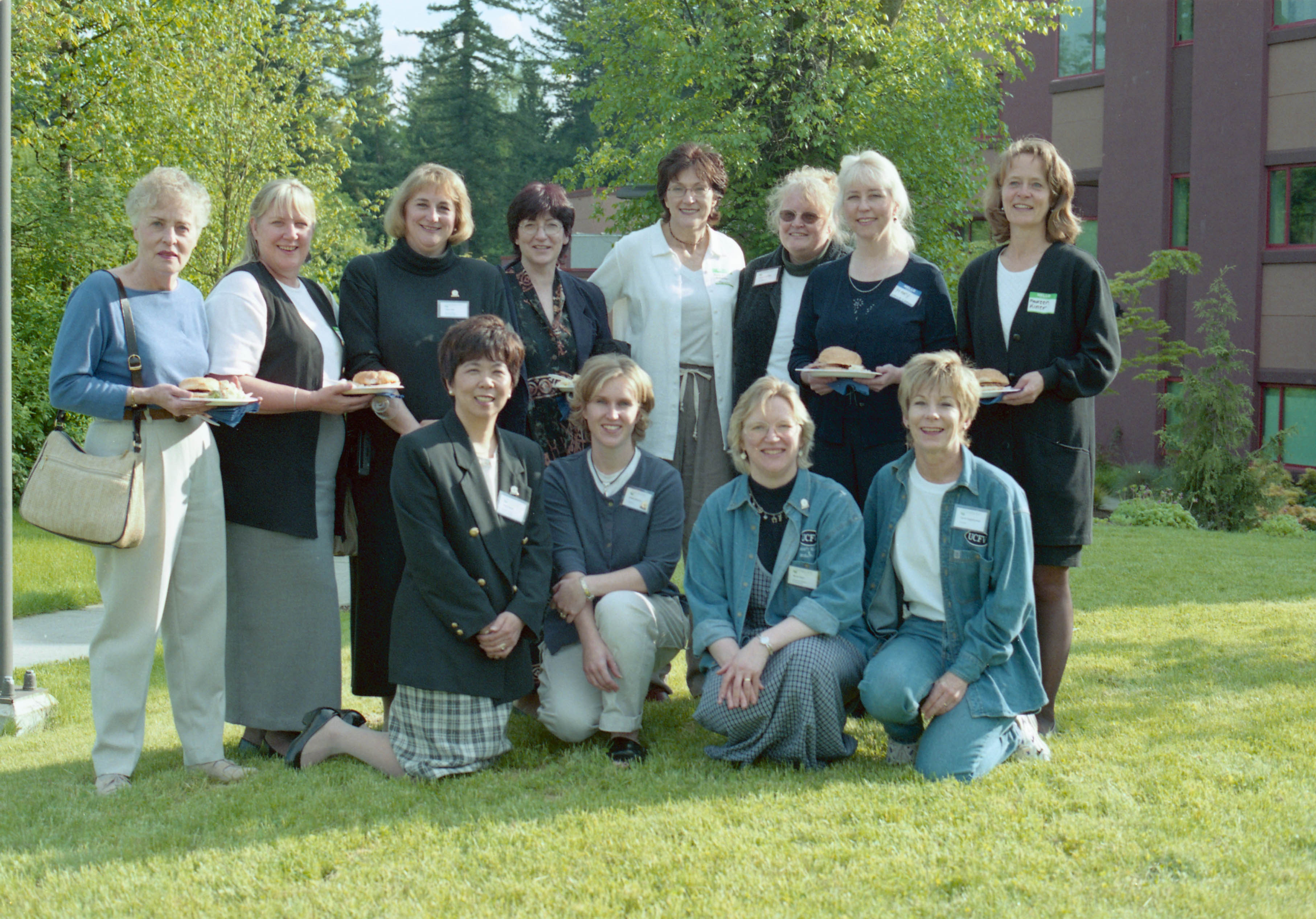 Faculty and alumni of the Office Careers program (renamed Applied Business Tech in 1997) gather at the UCFV Alumni Reunion on May 6, 2000 on the Abbotsford campus green. Back row: Betty Mitchell (retired faculty), Kathie Ramsay (faculty), Jill Smith (aka Jill Vike, exec assistant to the president), Jane Dean (faculty), Bonnie Anderson (faculty), Kathy Gowdridge (alumna, worked at UCFV), Mary Rigby Jones (alumna, worked at UCFV), Maurenn Kiner (faculty). Front row: Sandi Sasaki, ___________, Nancy den Boesterd (alumna, worked at UCFV), Carole Higginbottom (worked at UCFV).