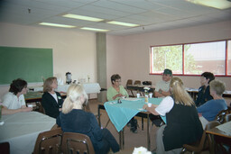 Alumni Reunion weekend. Office Careers (by then known as Applied Business Tech) reunion. Annette Aerssons of Registration (and Office Careers alumna) is far left. Instructor Maureen Kiner is second from left. Leslie Williams is the man in green cap. Instructor Jane Dean is fourth from left, beside Leslie. Retired Office Careers instructor Betty Mitchell is beside Jane (obscured). Instructor Katharine Ramsey is beside Betty.