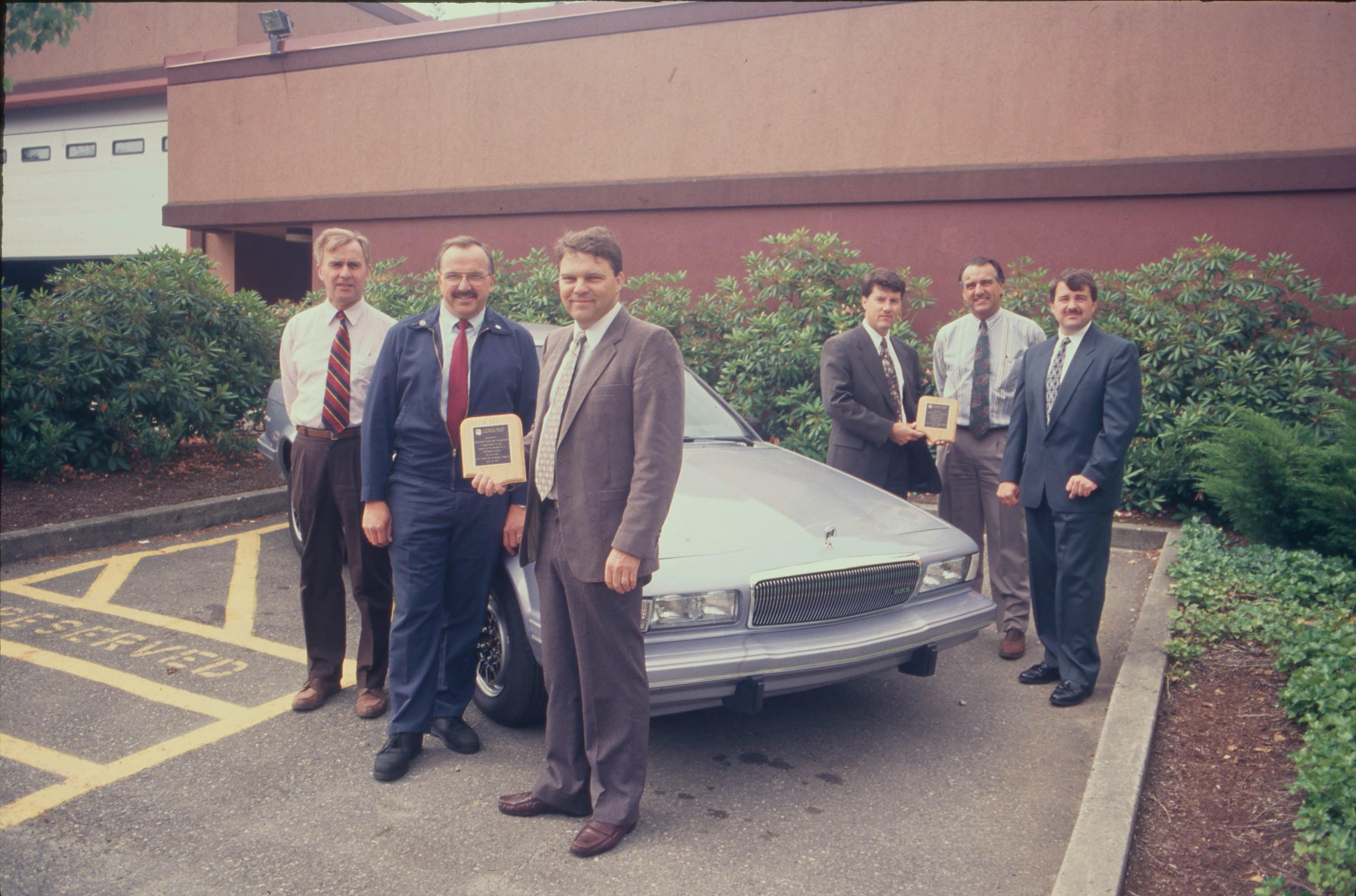 L-r: President Peter Jones, automotive instructor Rolf Arnold, and board member Norm Koch in front. VP Dick Bate and donors in back. Recognition ceremony for a car donation.