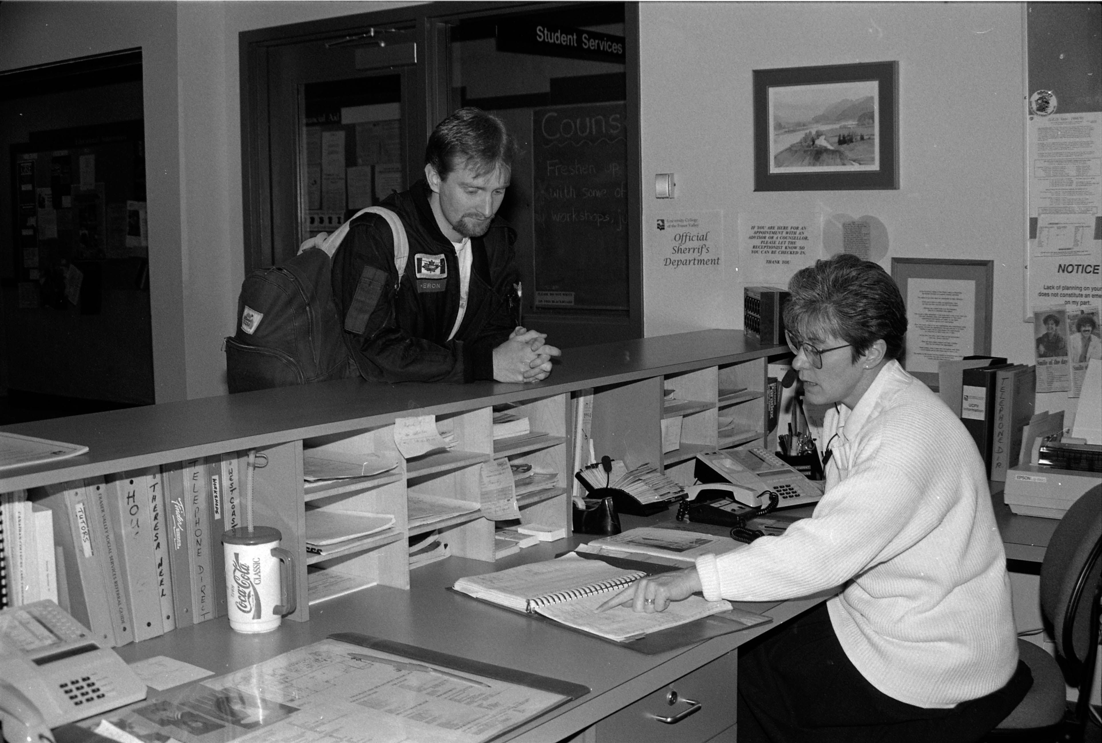 Summary Content type Content type Image Collection(s) Collection(s) UFV Photo Archives Resource Type Resource Type Photograph Genre Genre photographs Origin Information Origin Information Date Created/Date Issued 1995-02 Abstract/Description Description / Synopsis Description / Synopsis Dawn Fennell helps a student in Student Services office. Physical Description Extent Extent 1 negative Physical Description Note Physical Description Note Digitized by Abigail Taggart Access and Rights Rights Statement Rights Statement IN COPYRIGHT - EDUCATIONAL USE PERMITTED Subjects and Classifications Keywords Keywords Abbotsford, Building B (present) Subject Name Organization Subject Name Organization University College of the Fraser Valley