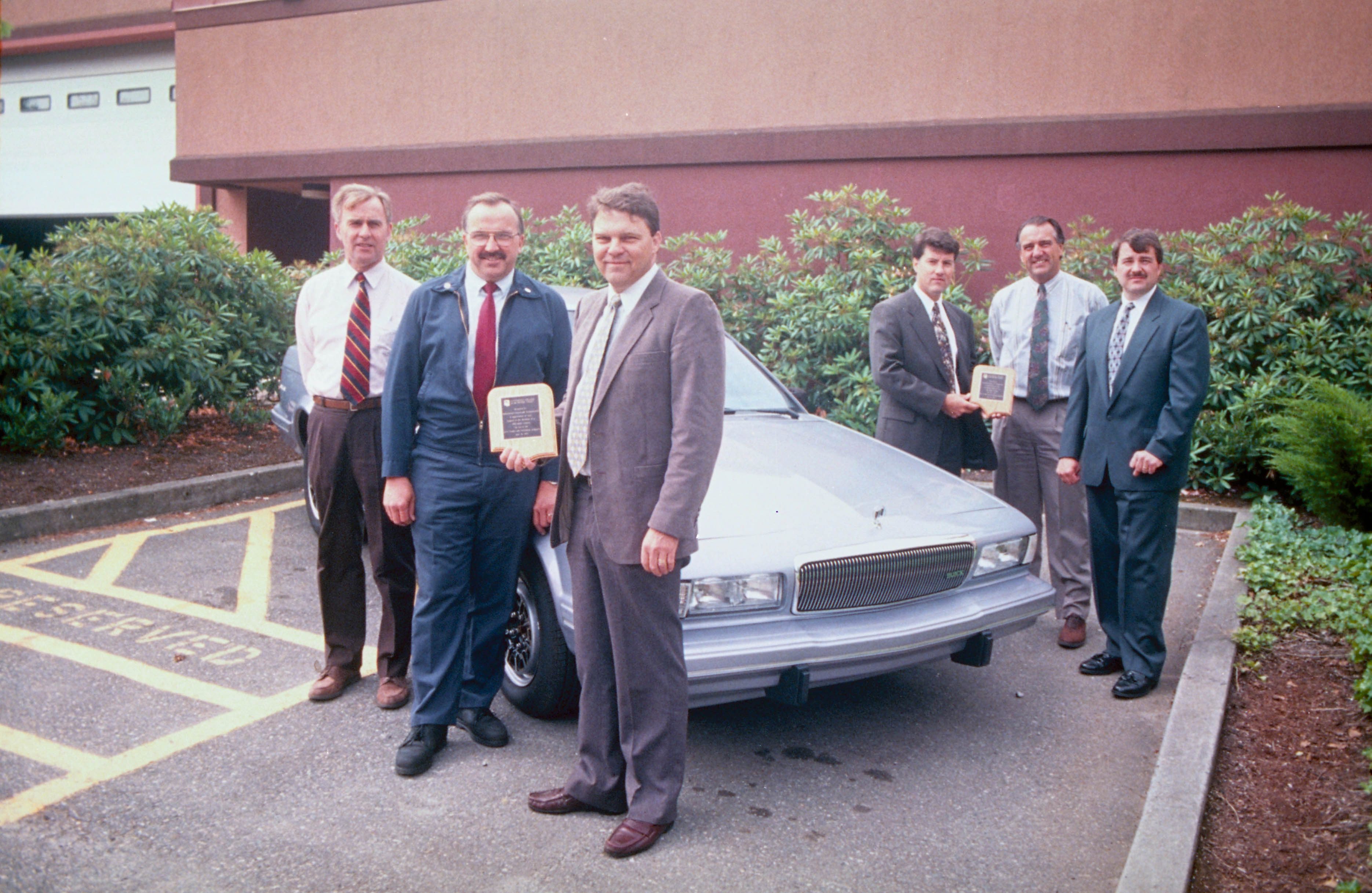 A thank-you ceremony for a car donation. Board member Norm Koch is in the forefront on the right with president Peter Jones on the far left an automitive instructor Rolf Arnold in the middle. Dean and VP Dick Bate is in the background, flanked by two repr