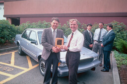 A thank-you ceremony for a car donation. Board member Norm Koch is shaking the hand of UCFV president Peter Jones. Dean and VP Dick Bate is in the background, flanked by two representatives fo the company that donated the car.