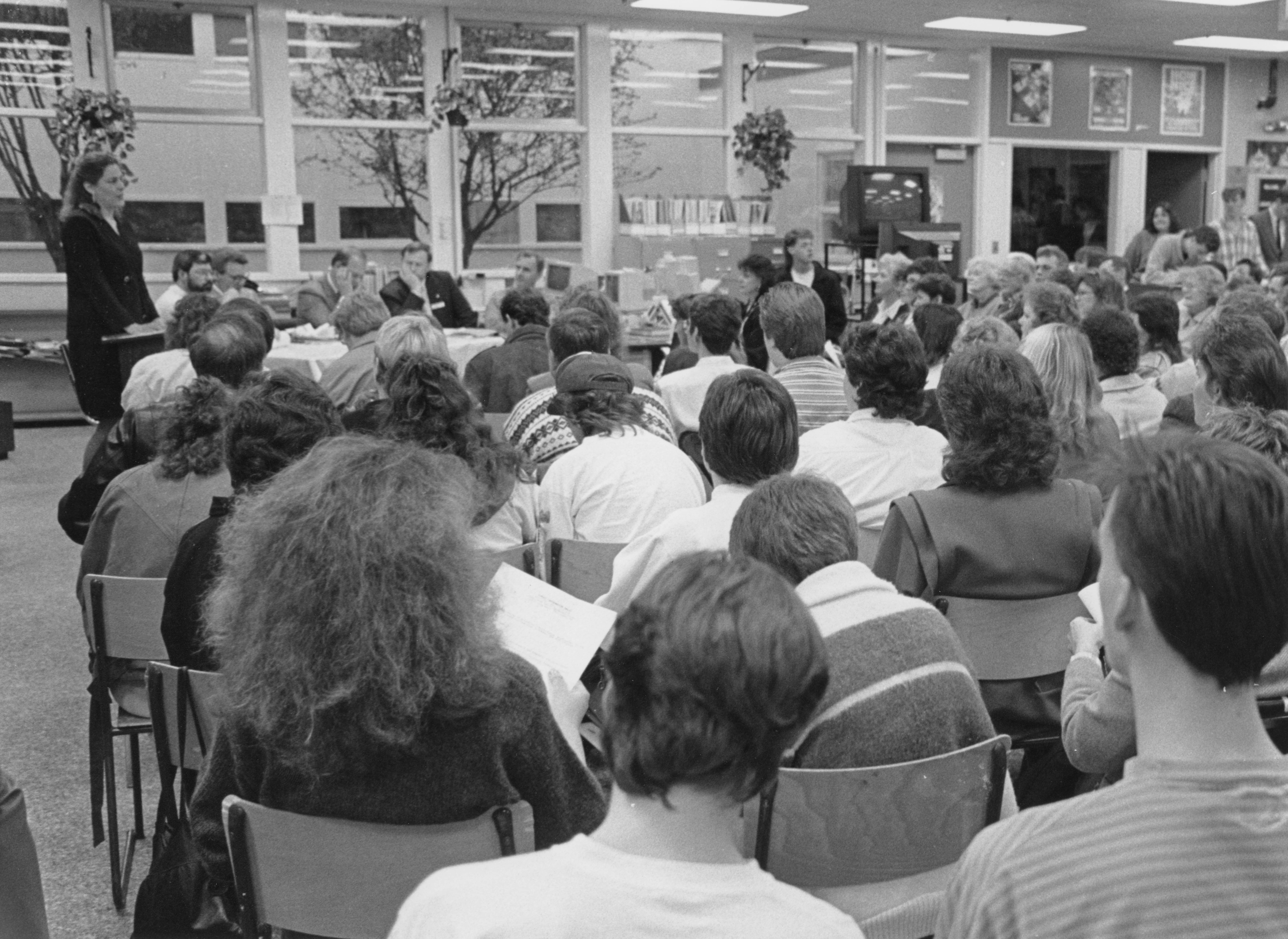 Sue Gadsby, FVC Office Careers alumna and co-leader of the Community Coalition to Support the UCFV Proposal, speaks to a crowd of 250 people at a rally to support the university-college concept, held at Chilliwack Senior Secondary on April 10, 1991.
